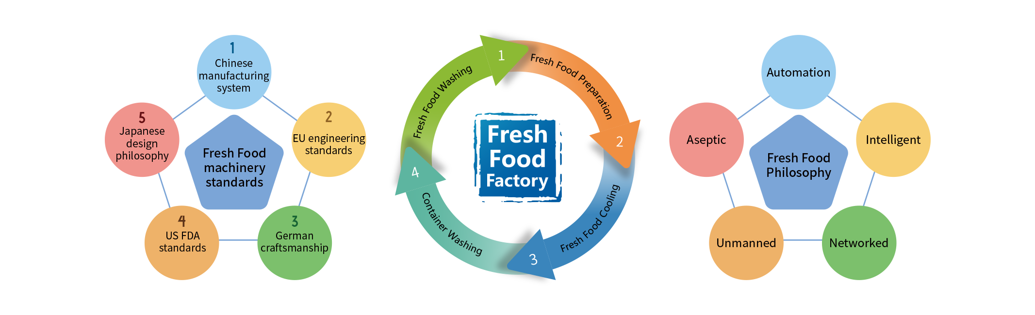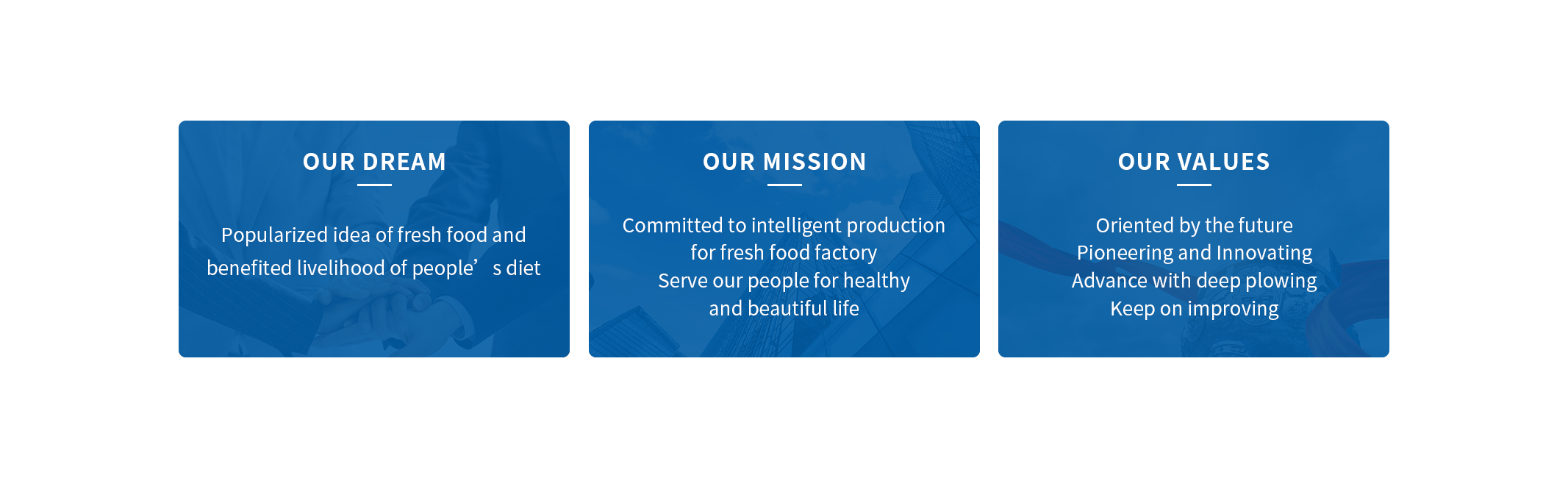 청다오(青岛) 신선식품은 "미래지향적, 개척혁신, 심도있는 탐구와 꾸준한 진취, 정진과 완벽 추구"라는 가치관을 고수하며, 식품가공기업의 이익증진을 출발점으로 삼고, 국민들이 건강식품을 즐길 수 있도록 하는 것을 최종 목표로 삼고 있습니다. 또한 "고도의 지능화 수준, 고도의 위생보호, 고도의 안전계수, 고도의 환경친화성"을 내용으로 하는 신선식품 이념을 보급하는데 힘쓰고 있습니다. 신선식품 공장을 보급함으로써 기업의 산업 업그레이드를 지원하고, 이를 통해 더욱 신선하고 우수한 식품을 생산하여 인류의 건강하고 아름다운 삶을 위해 서비스합니다.